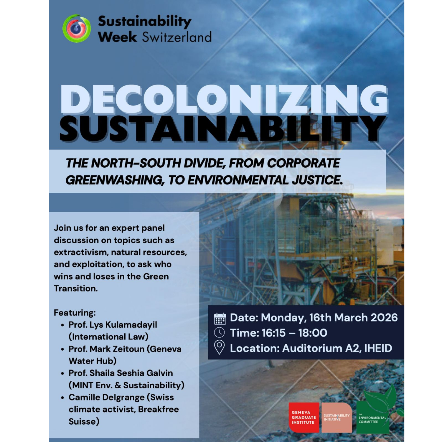 As part of Sustainability Week 2026, organised by the Geneva Graduate Institute, Mark Zeitoun, Director General of the Geneva Water Hub, will contribute to a panel discussion exploring the North–South divide in sustainability transitions.